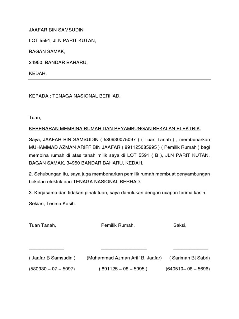Kecuali dengan kebenaran Pemilik. Beberapa Contoh Surat Perjanjian Membina Rumah yang Baik 2019. Surat makluman daripada jiran untuk tambahan ubahsuai rumah no.